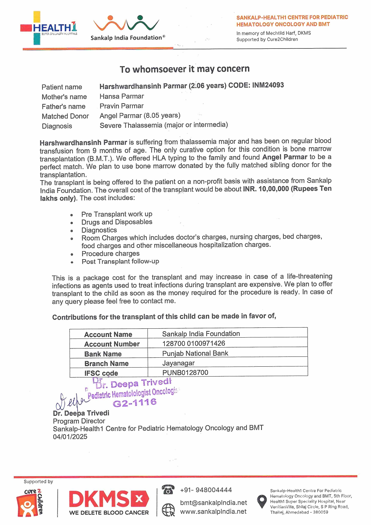 Patient Name :HarshavardhanParmar AGE :2.6year/Male Total cost :Rs.10,00,000/- https://balkrantifoundation.org/Donation/urgent-need-mast-harshvardhan-Parmar.html BALKRANTI FOUNDATION Appeal emergency case of Master Harshavardhan Parmar Age 2.6 years who is suffering from Blood cancer is in need of bone marrow transplantation and He is admitted in SANKALP-HEALTH1 CENTRE FOR PEDIATRIC HЕМАТOLOGY ONCOLOGY AND BMT Ahmedabad - 380059 his total cost is 10,00,000/- ( Ten lakhs Rupees) and he belongs to a poor family they can't afford that much cost so sir/ma'am, your small support can help him to live the life that you will donate you will get 50% tax benefits under section 80G.