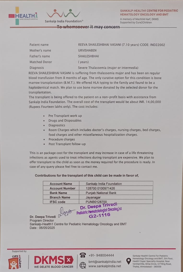 She is currently admitted to SANKALP-HEALTH CENTRE FOR PEDIATRIC HEMATOLOGY ONCOLOGY AND BMT in Ahmedabad. The total estimated cost for her treatment, including the critical transplantation procedure, is ₹ 14,00,000/- (Fourteen Lakhs Rupees).