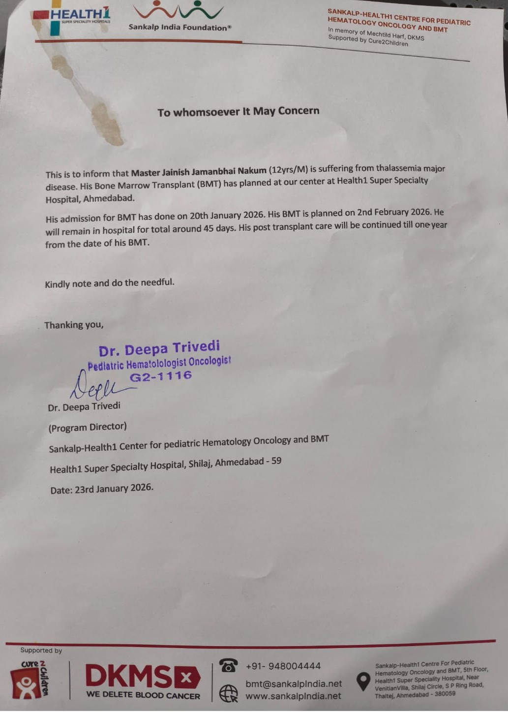 According to his doctors at SANKALP-HEALTH1 CENTRE FOR PEDIATRIC HEMATOLOGY ONCOLOGY AND BMT in Ahmedabad, the only curative option for his condition is Bone Marrow Transplantation (B.M.T).