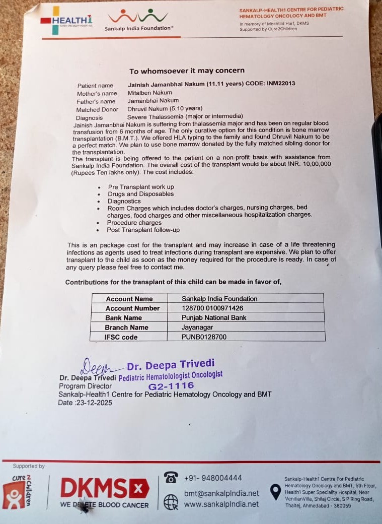 Jainish belongs to a humble family that is struggling to arrange this massive amount. They have exhausted all their resources and are now looking to you for support to give their son a chance at a healthy, transfusion-free life.