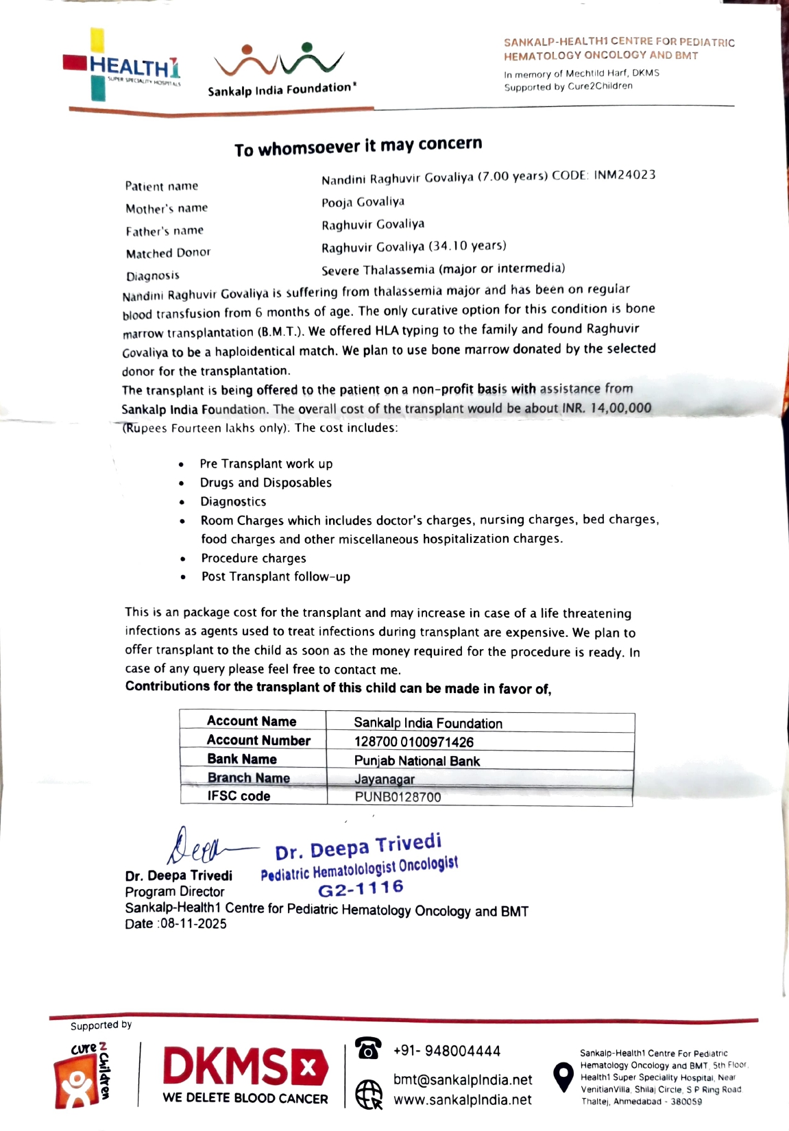 Every donation, small or large, makes a massive difference in Nandini's journey back to health. Your compassion can give her the future she deserves. Let's join hands to save this precious life.